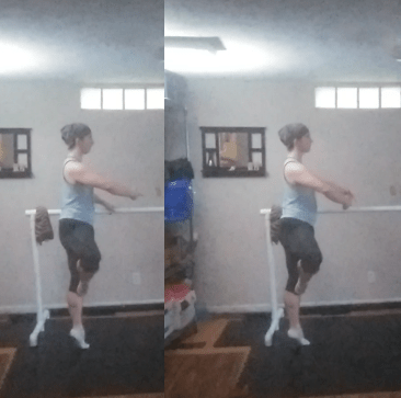 On the right, I’ve fallen backwards, so I’m having to work really hard to stay on a lower demi-pointe. My hips are no longer stacked over the ball of my foot, so I’m forced to hold myself together by muscular effort, instead of allowing bones and gravity to do their job.