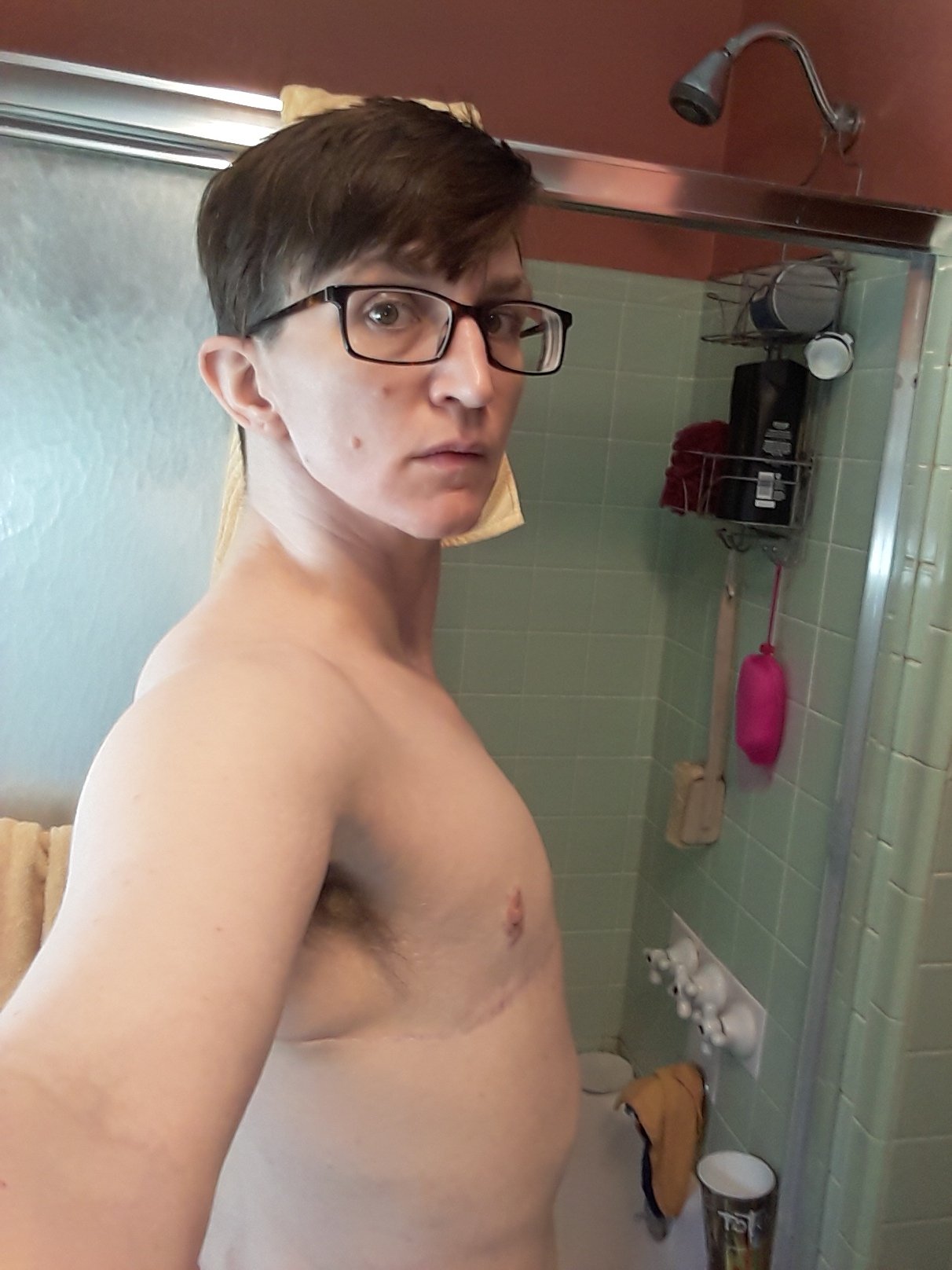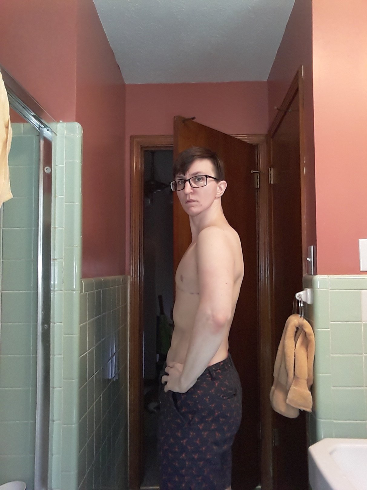 There are two little spots on the left side where I got itchy, scratched off the tape early on, and wound up with irritation that led to a slightly different scar type. These are still kinda pink right now, but they’re my usual hypotrophic scars. They’ll eventually turn white. I’m not worried about them.
