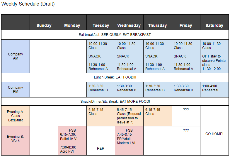 I have literally no idea what Theater Week for our first production will look like, nor whether the Nutcracker run will in any way resemble its usual self, so I’m not even going to try to make a draft plan for Theater Week right now.