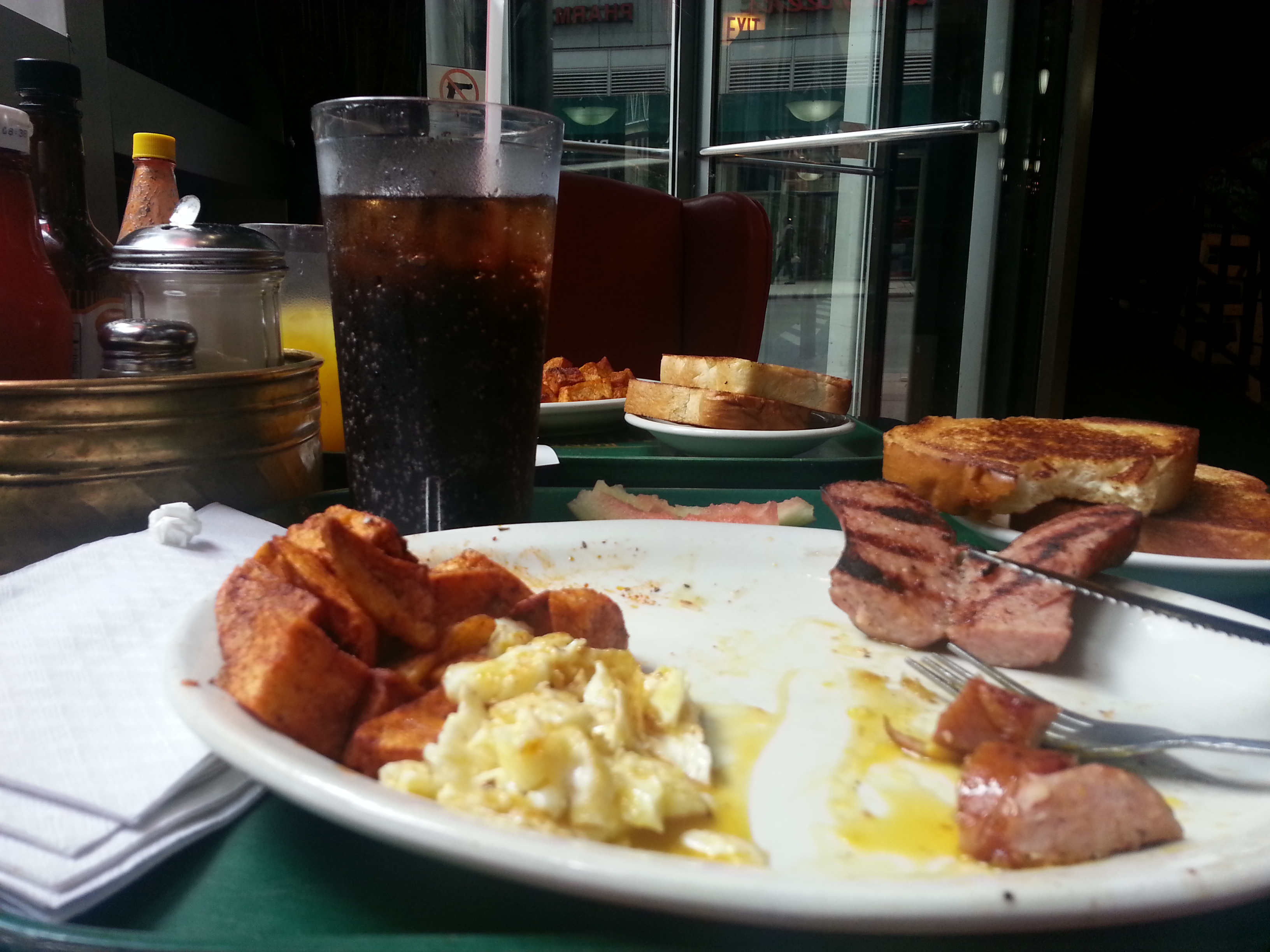 For $8, my Ronny’s breakfast included some 8″ of Polish sausage (yeah, yeah, go ahead with the 8″ Sausage jokes, Internet), a pile of crisp and delicious home fries (billed as “hash browns,” because LIARS) that probably weighed a pound, two enormous eggs skillfully cooked over-easy, two gigantic slices of Texas toast, and a little slice of watermelon.