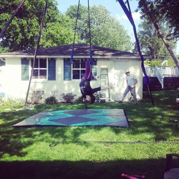 The portable rig is by Ludwig; Patti at Aerial Animals made the trapeze. I didn’t think to ask D where sourced the silks. When I asked about the mats, he said, “We’re making China great again,” heh.