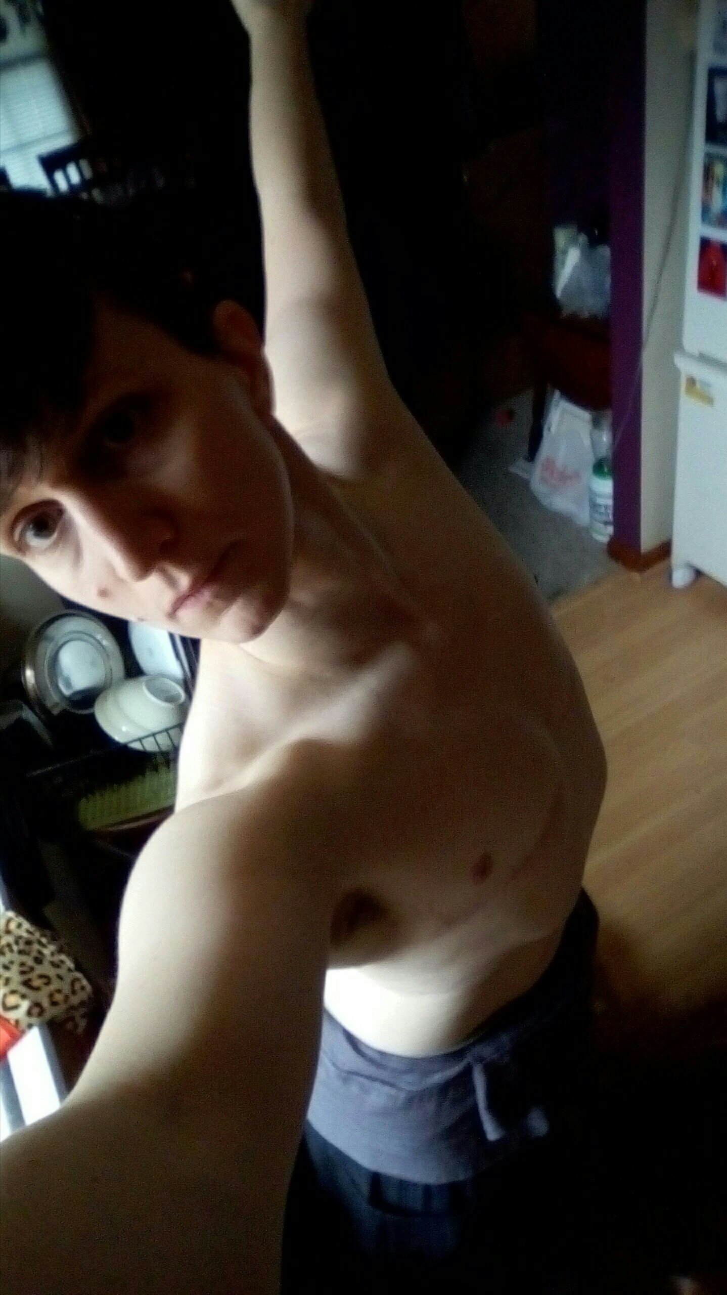 The left side is particularly clean, even though the incision is a good 2 cm longer. I suspect that the portion towards my arm will be invisible within a few months. It’s actually less visible IRL; for whatever reason, cameras tend to enhance the redness of these things. Also, I have no idea why I’m making my “What did you say to me?!” face here. In other news, this is what my pecs look like when I’m not flexing like an overwrought high school kid.